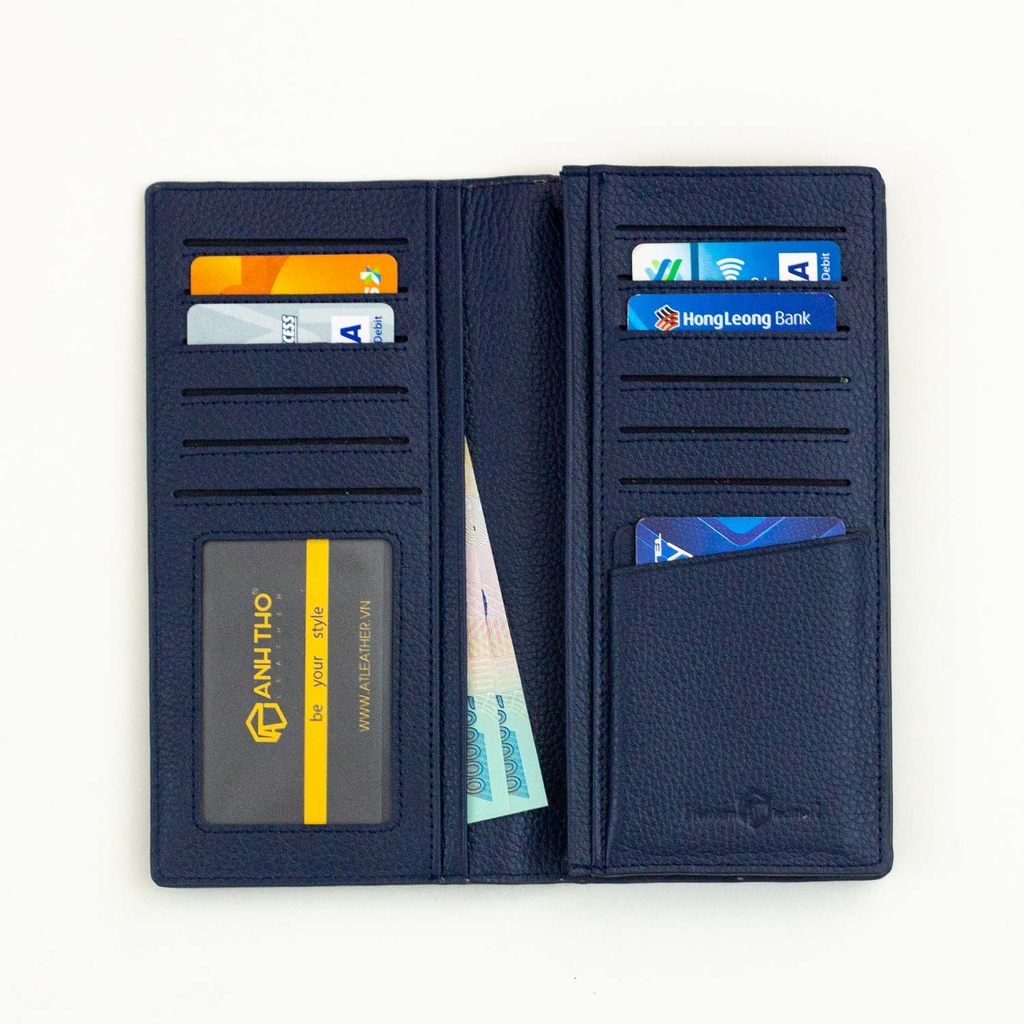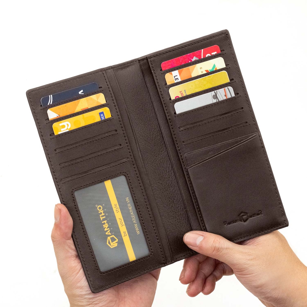 Bên trong ví gồm bốn ngăn lớn bố trí khoa học, có một ngăn xếp ly tăng không gian chứa, cùng nhiều ngăn thẻ và ngăn ảnh tiện dụng, phù hợp với người dùng cần sự gọn gàng nhưng vẫn giữ nét lịch lãm. Bộ sản phẩm đi kèm hộp sang trọng và phiếu bảo hành chuẩn Anh Thơ Leather.